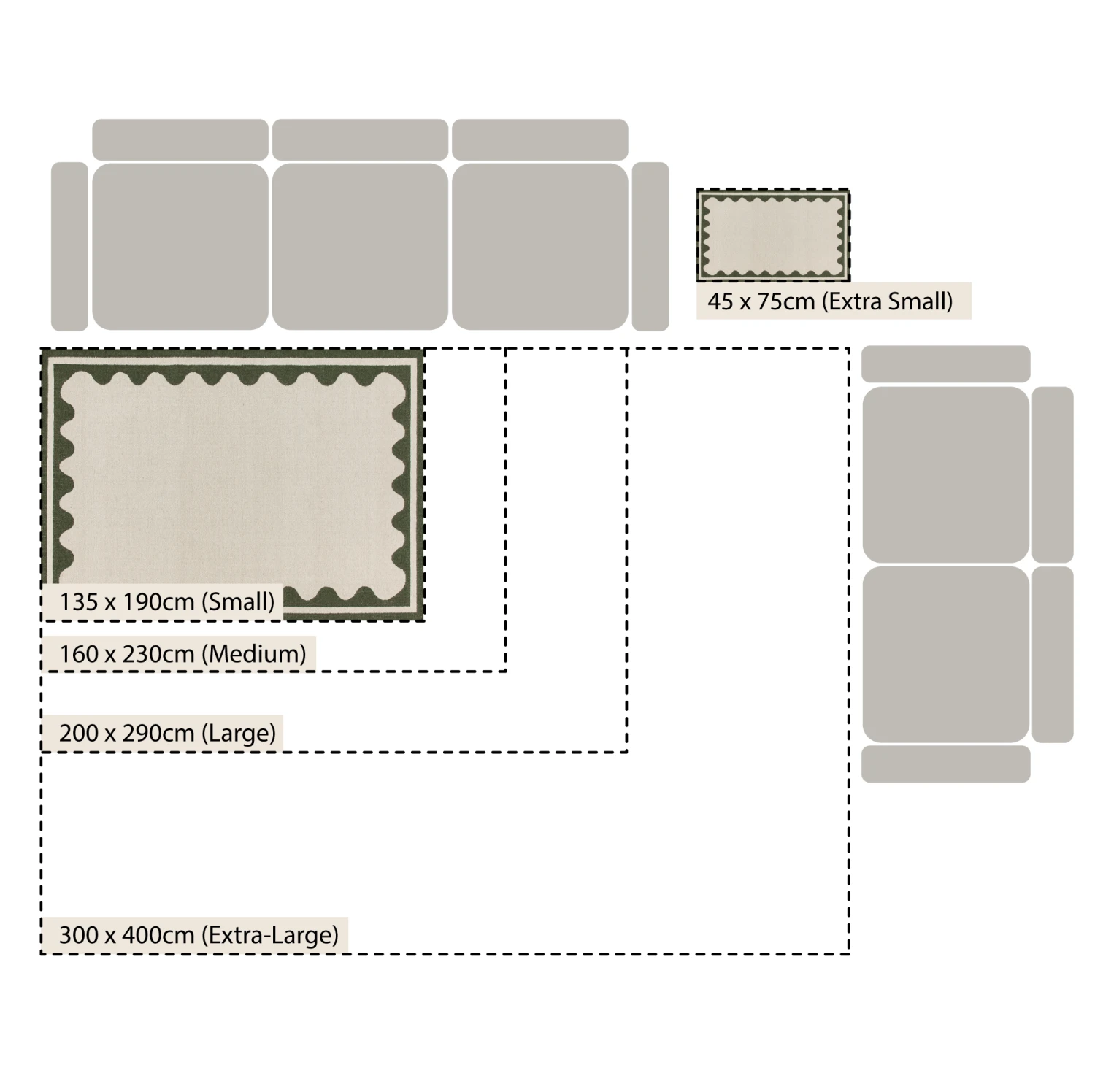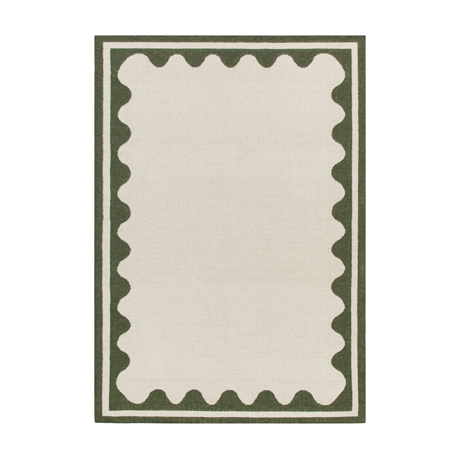 - This stylish cream rug is beautifully finished with a scallop olive green border, perfect for framing a coffee table or adding a touch of colour to any space