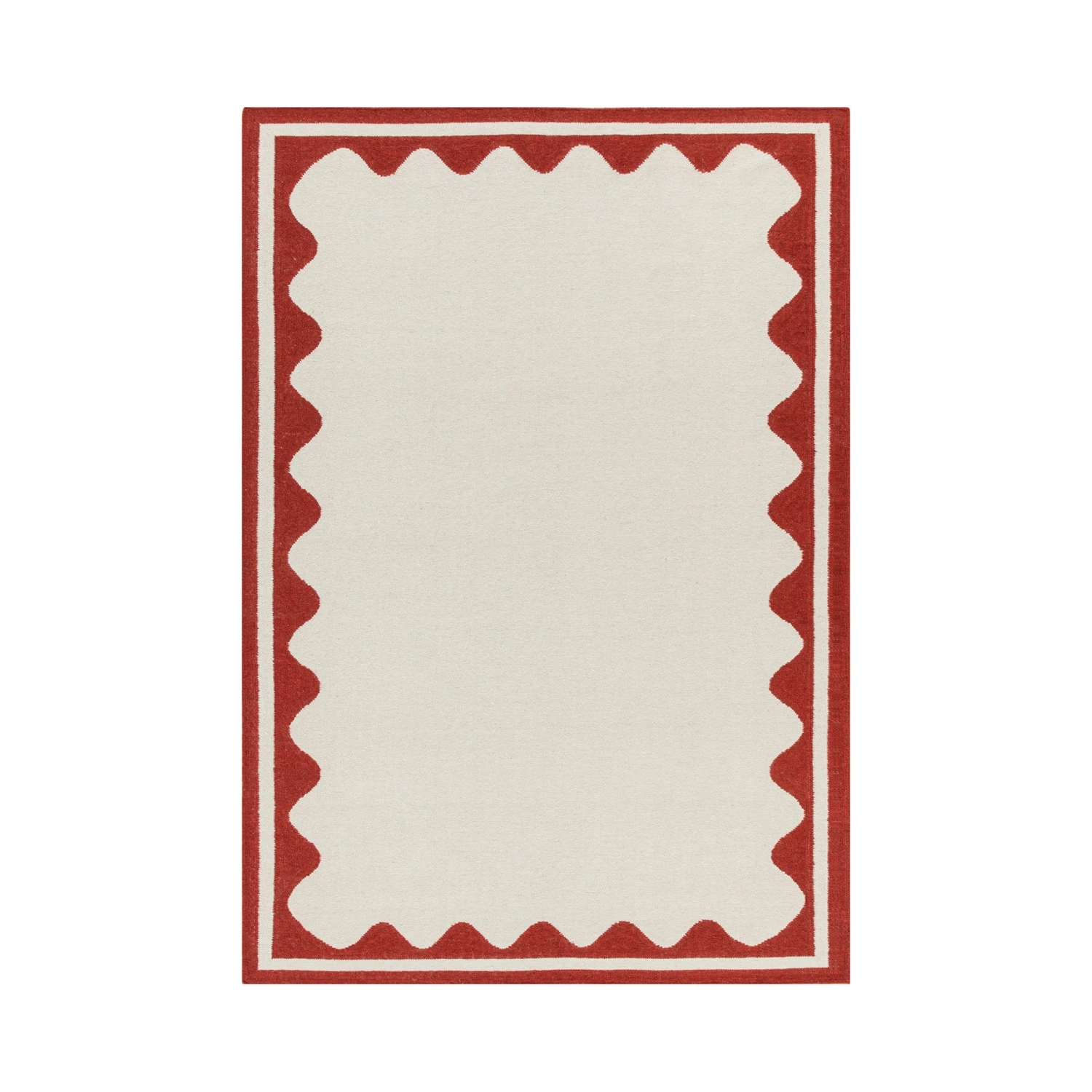 - This stylish cream rug is beautifully finished with a scallop scarlet red border, perfect for framing a coffee table or adding a touch of colour to any space