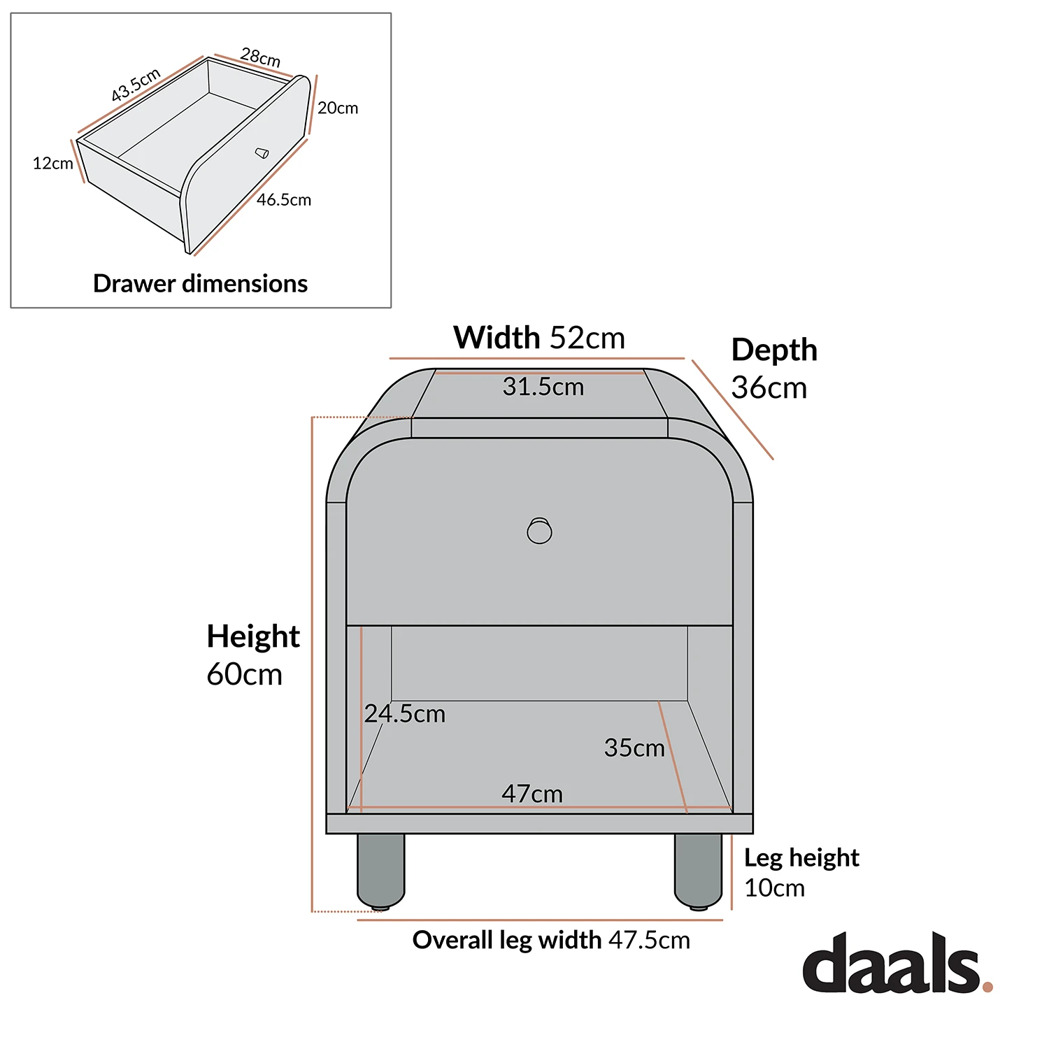 - Drawer internal storage space: W 43.5 x H 12 x D 28 cm