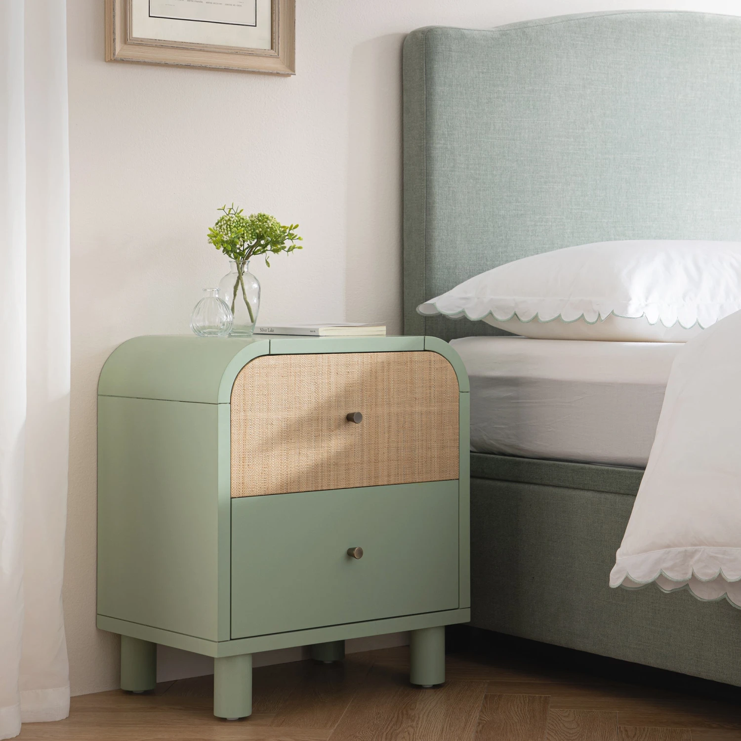 - Bring soft, grounded charm to your bedroom with our Maude bedside table in Muted Pistachio.