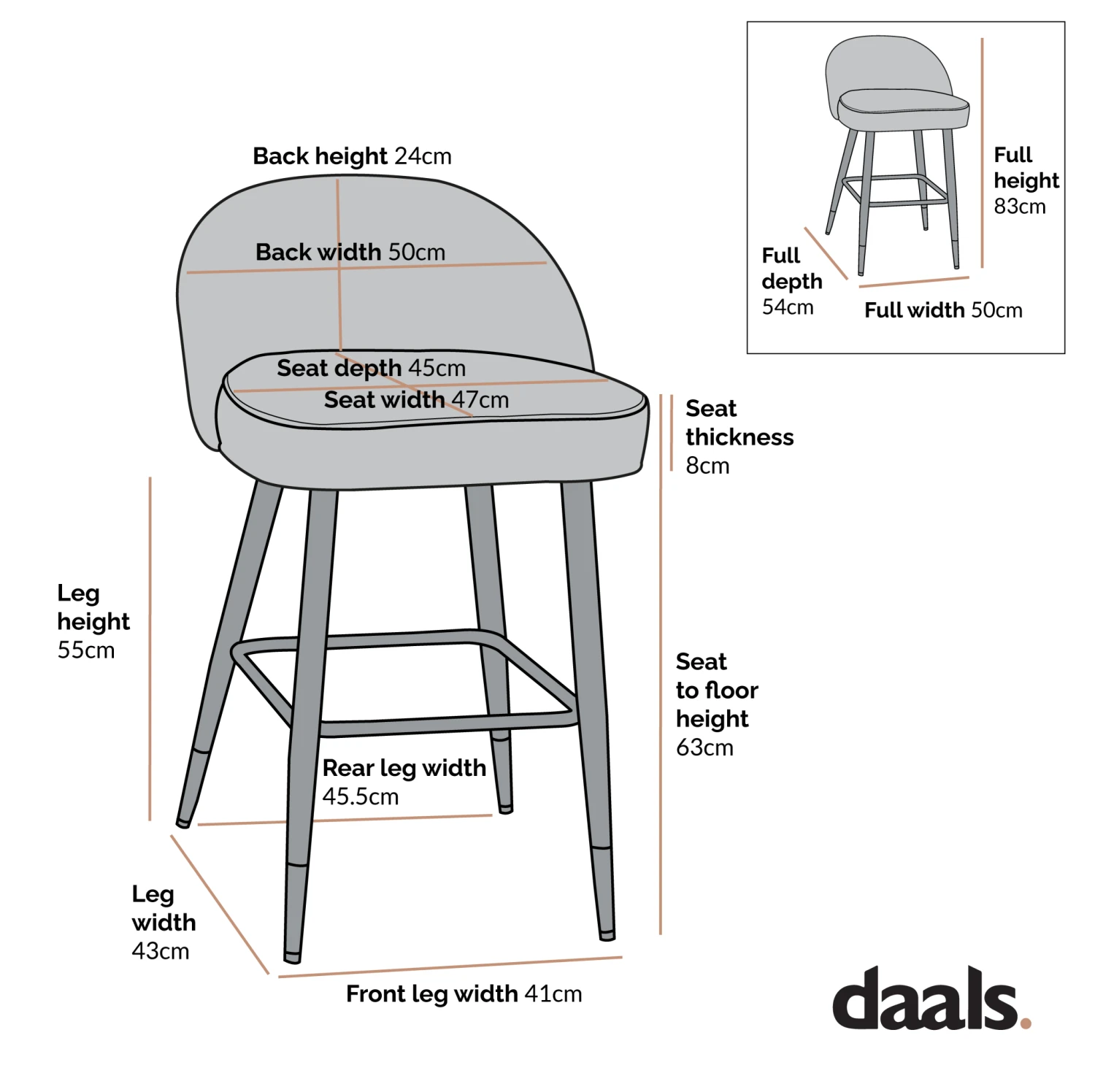 - Size: W 50 x D 54 x H 83 cm. Seat height: 63 cm.