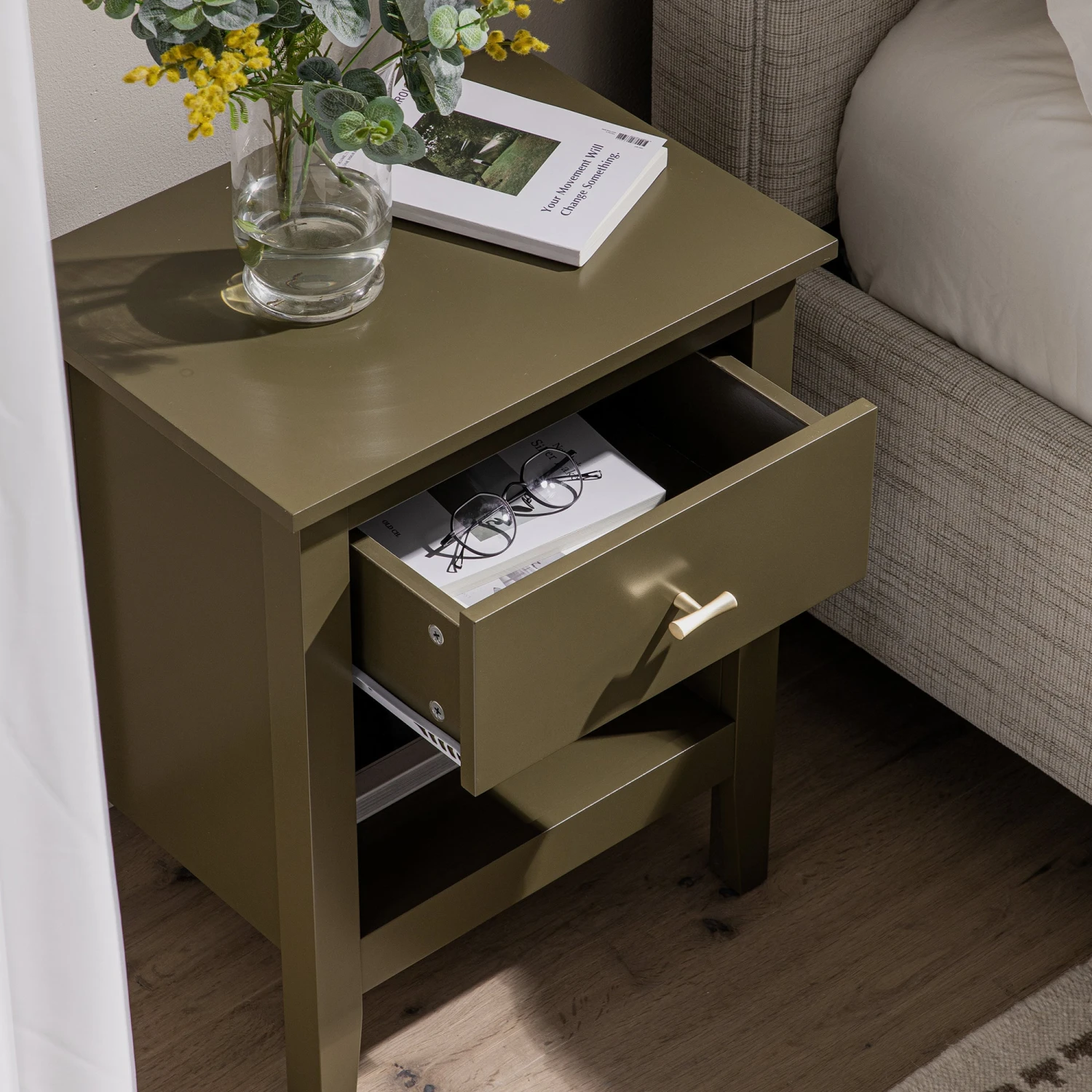 - Complete the look: Pictured with our Oakham Olive Grove 1-Drawer Bedside Table is our Porchester Oatmeal Fabric Ottoman Storage Sleigh Bed, Matilda Beige Gingham Scallop Quilted Bedspread, Dulcie Cream Wool French Knot Cushion and Atlan Cream & Taupe Handwoven Wool Rug.