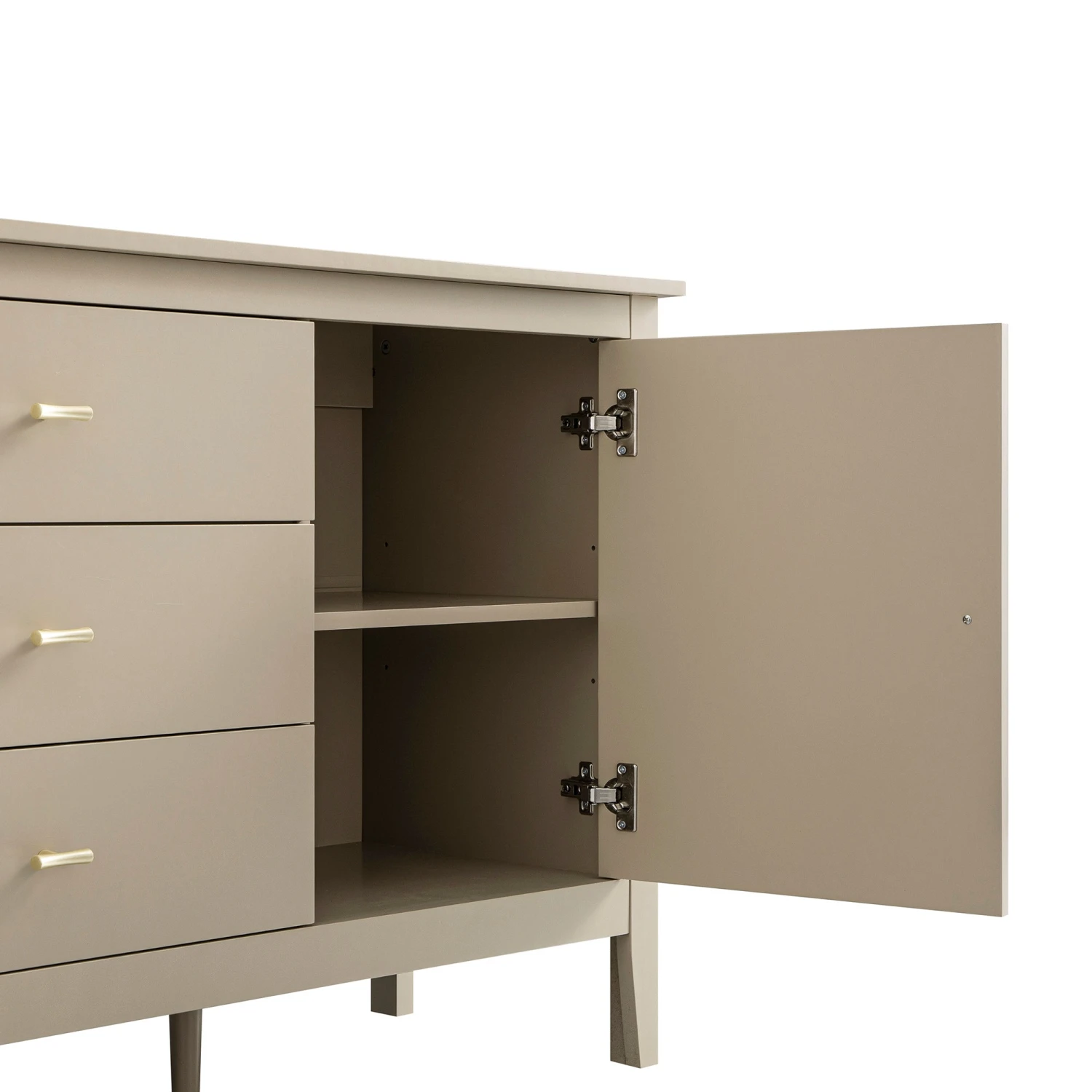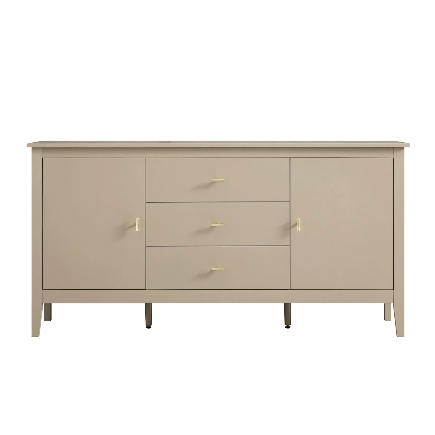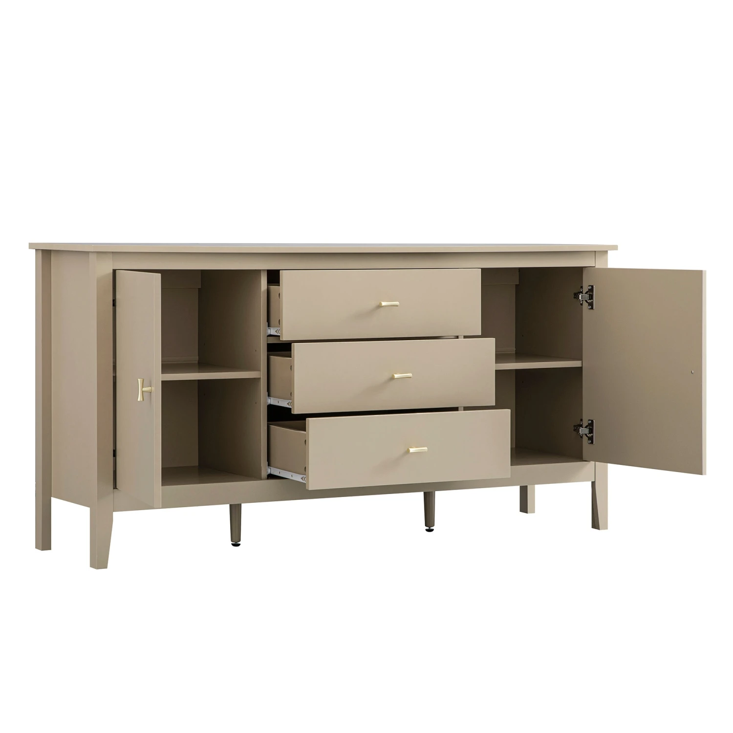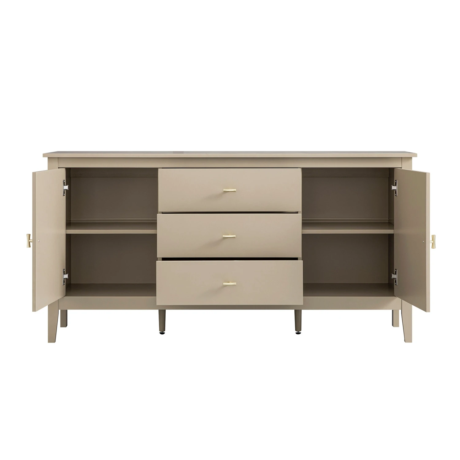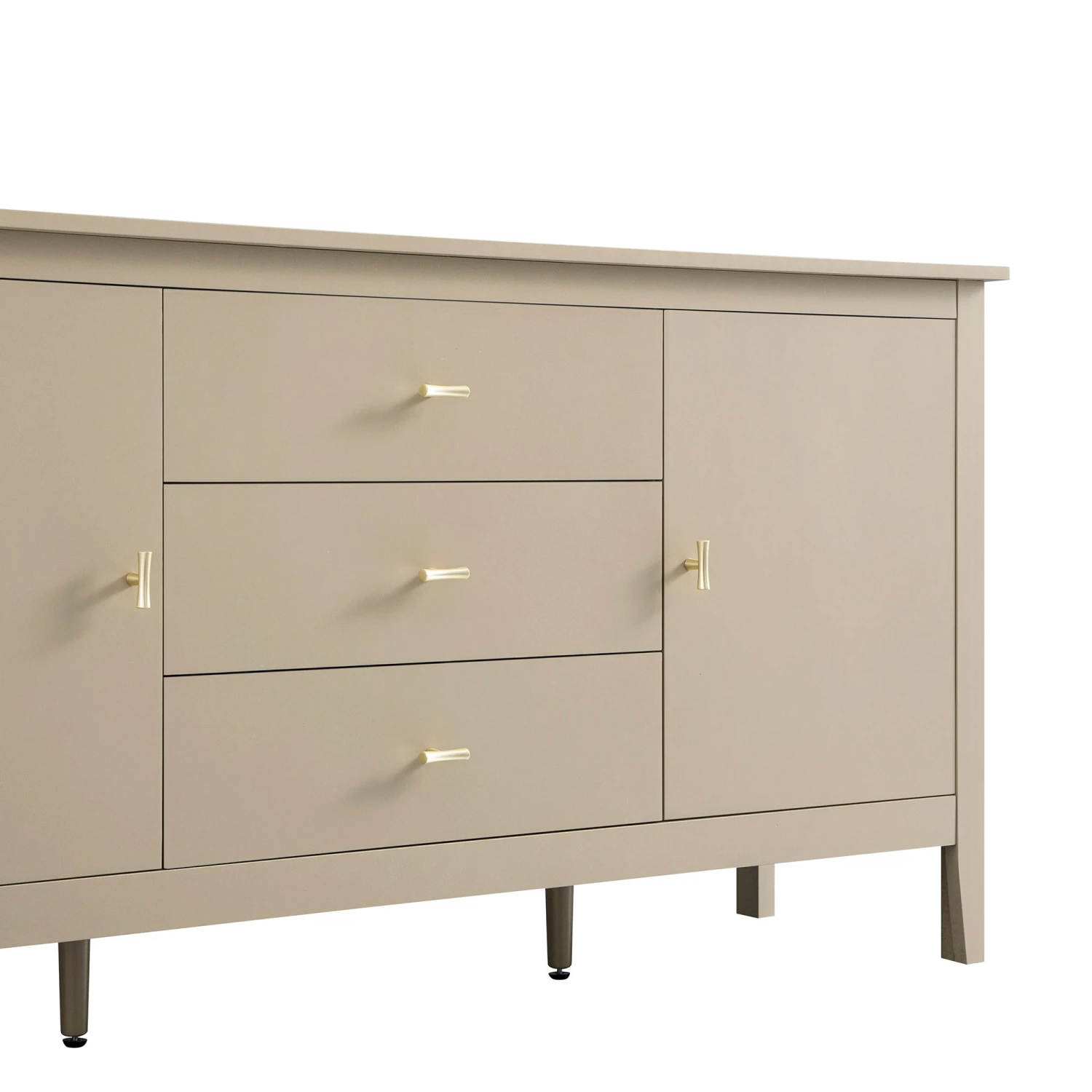 - Sturdy yet elegant, the sideboard stands gracefully on slender legs, enhanced by adjustable central supports to ensure stability across any surface.