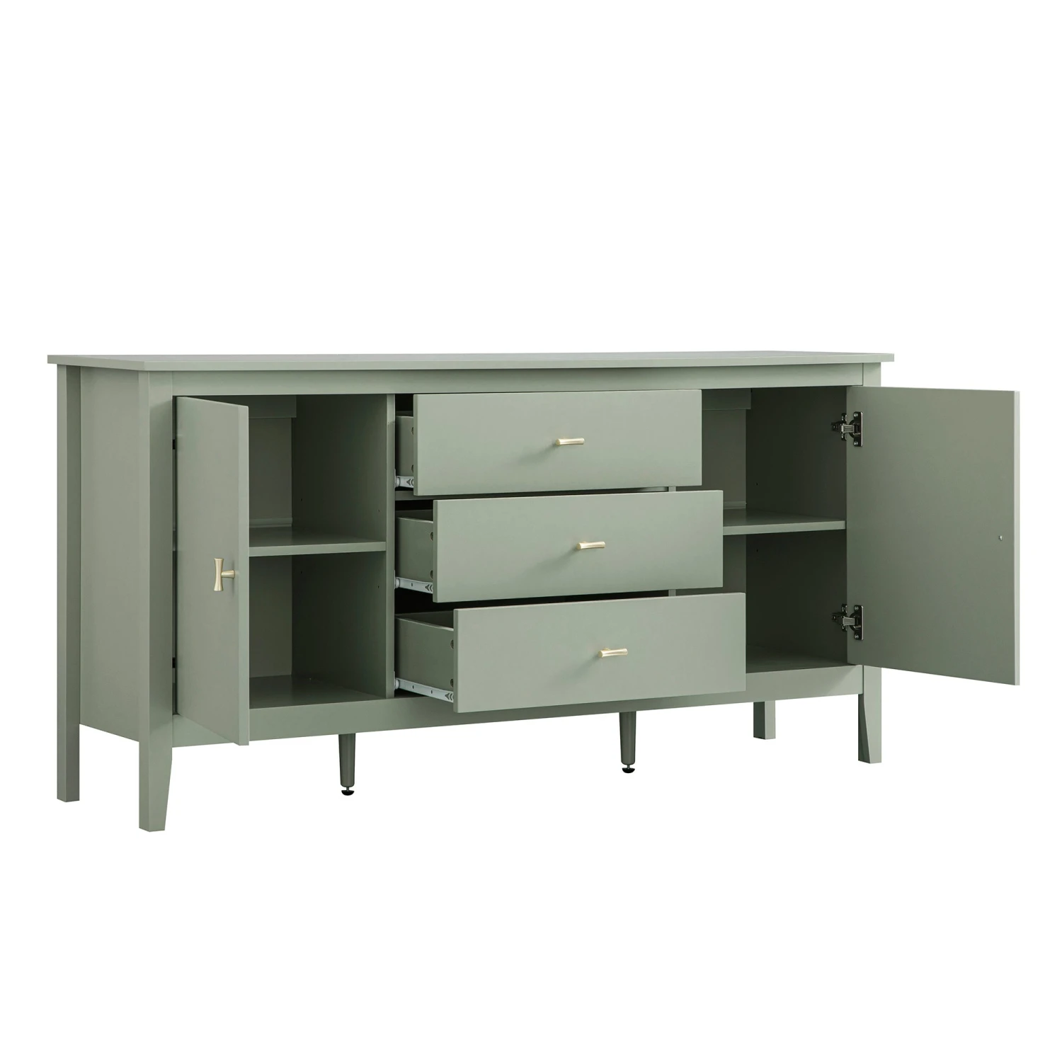 - Three central drawers provide easy access to everyday essentials, while the cupboards on either side include adjustable interior shelving for neatly tucking away bulkier items.