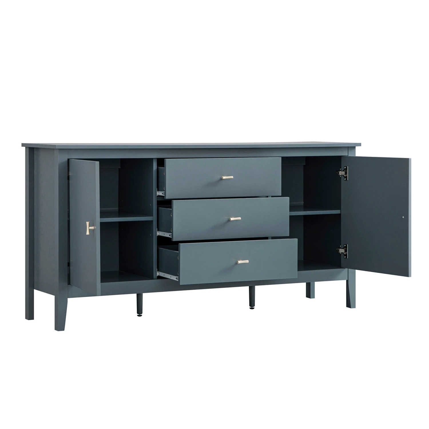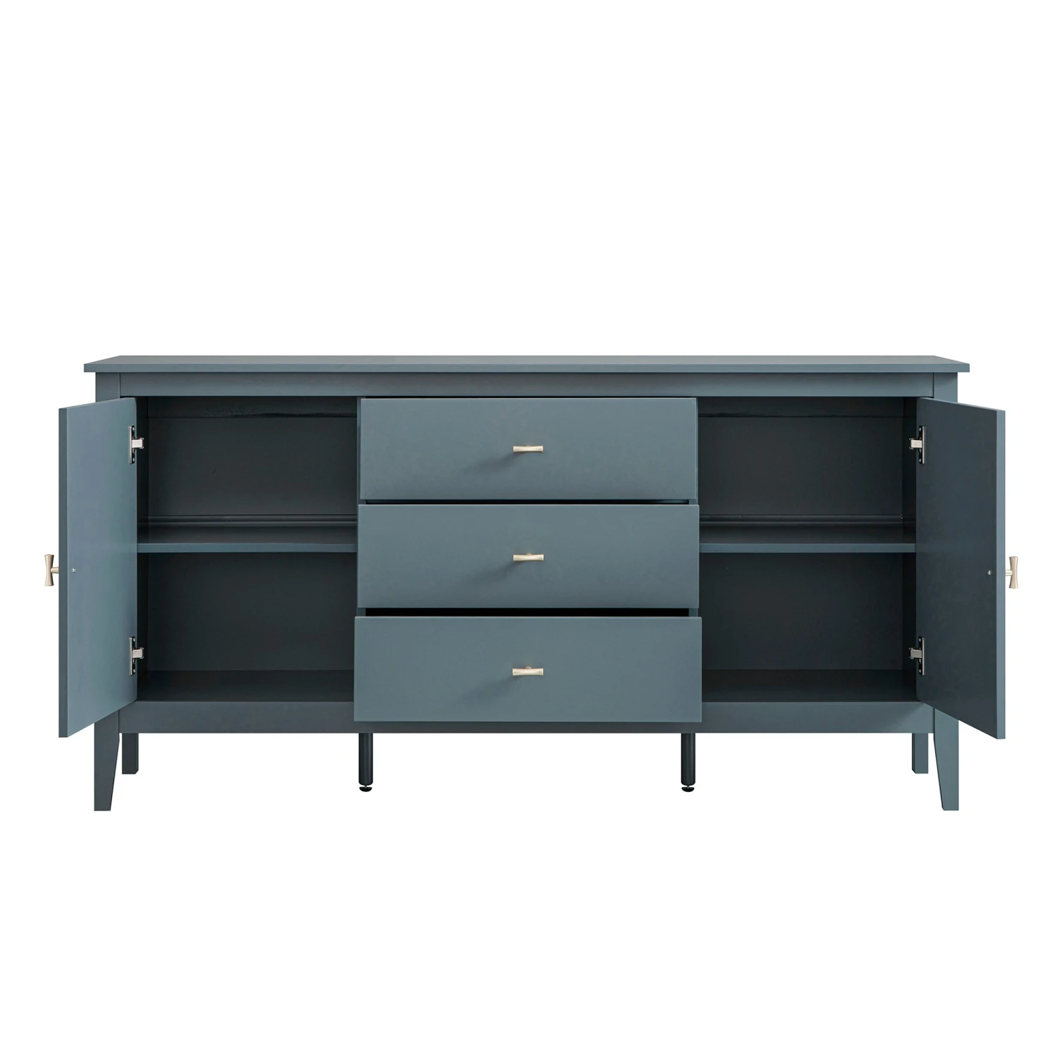 - Lifted lightly on slim legs with central support for stability, this sideboard blends timeless lines with a contemporary palette.