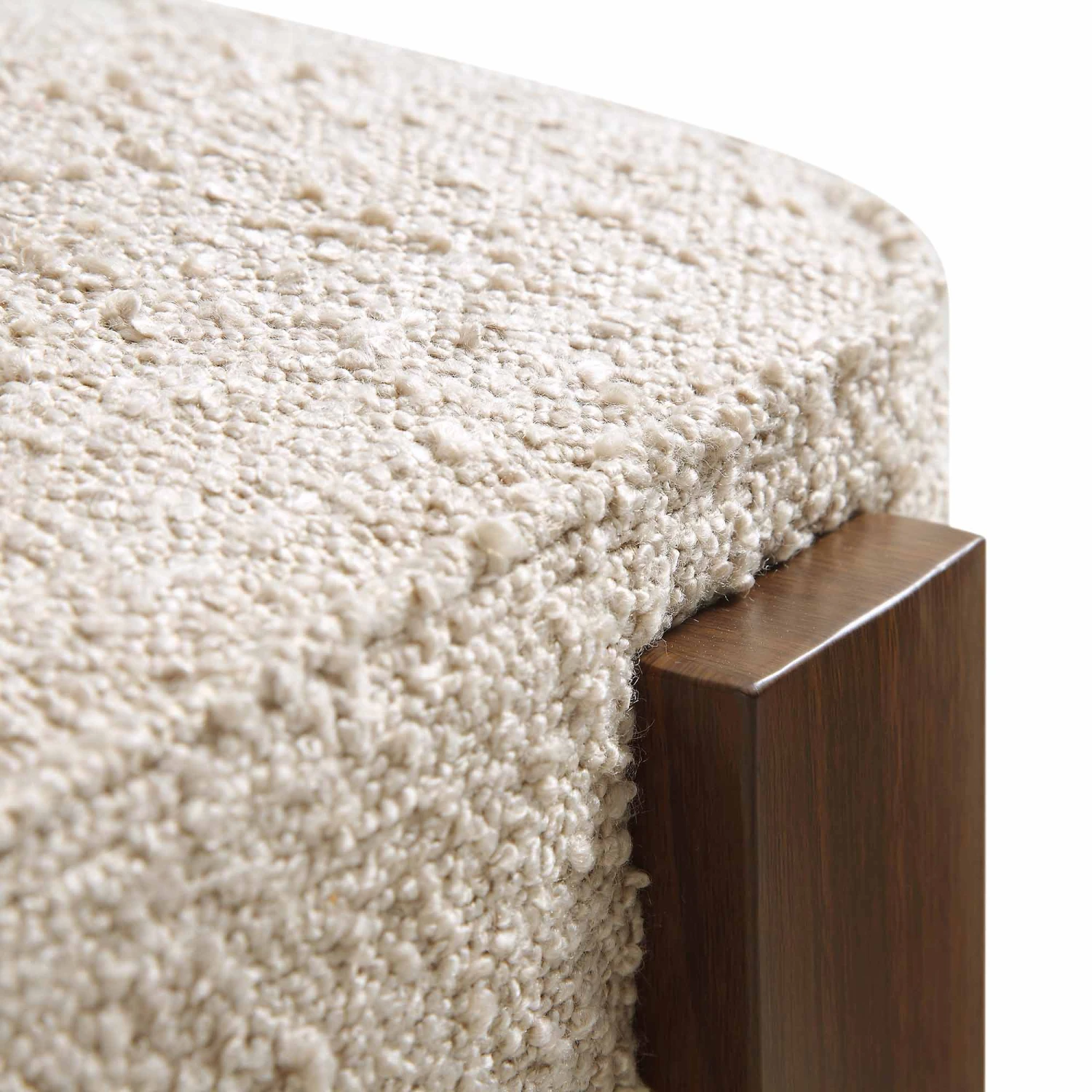 - Well-cushioned seat and backrest upholstered in textured boucle fabric.