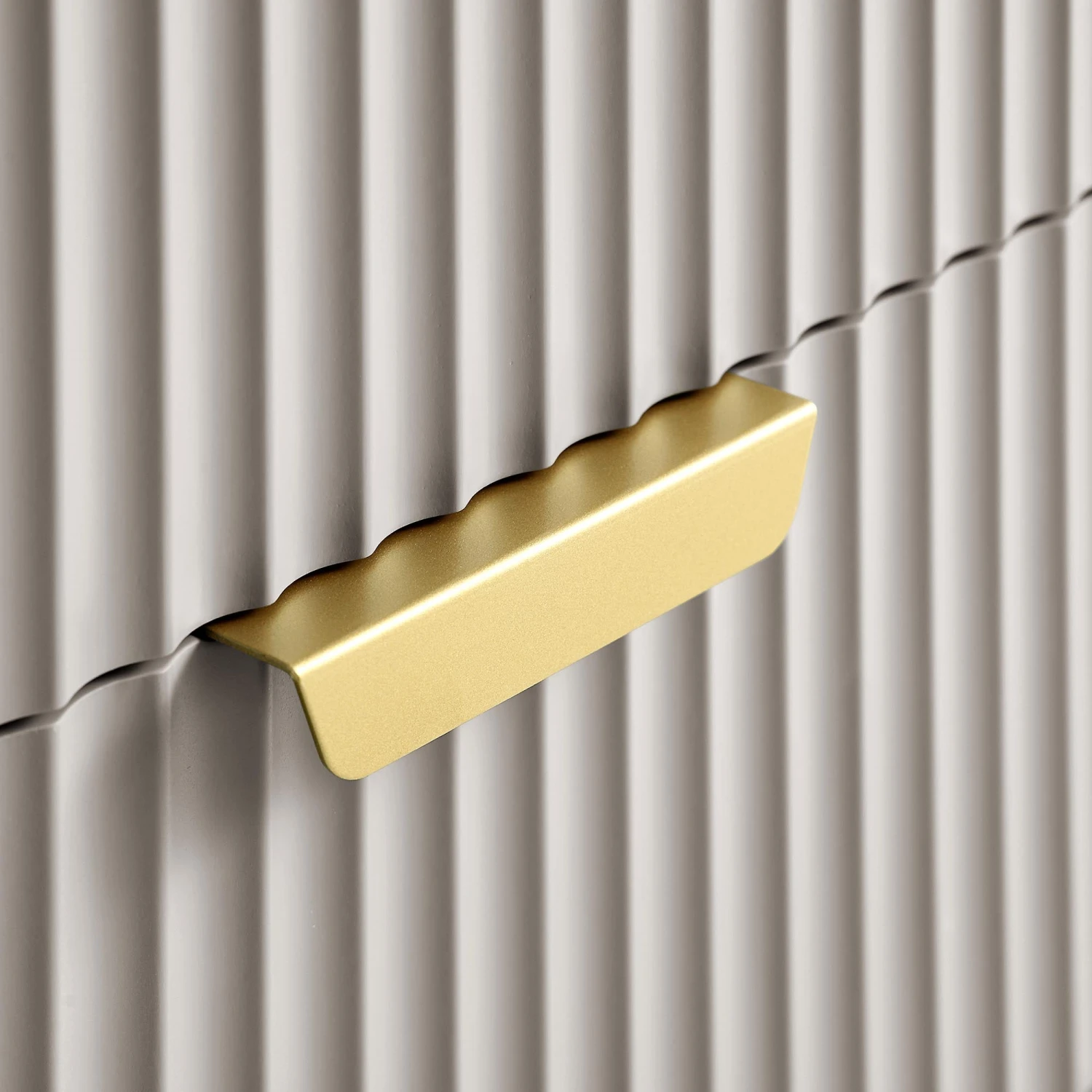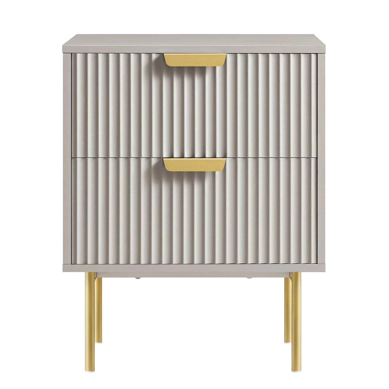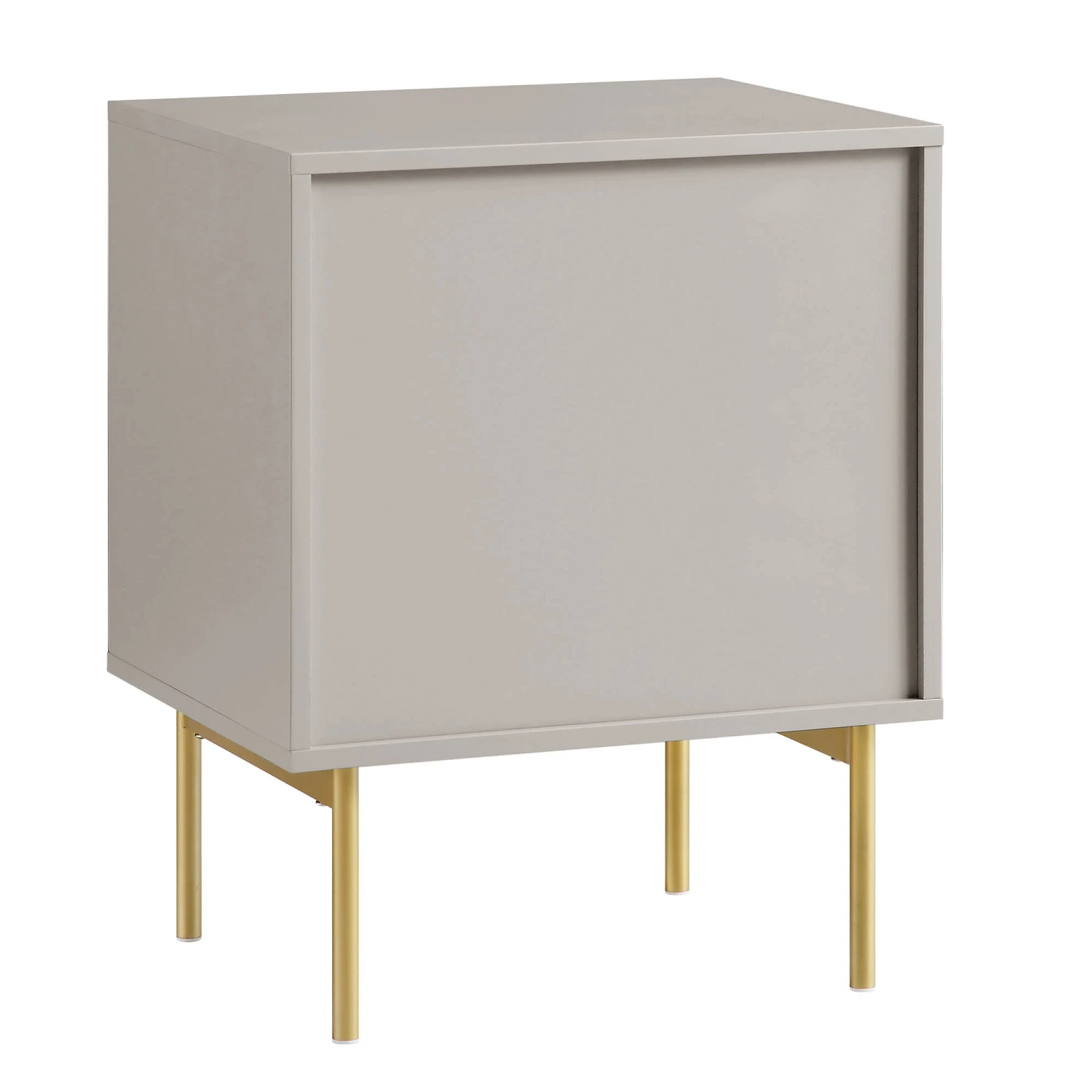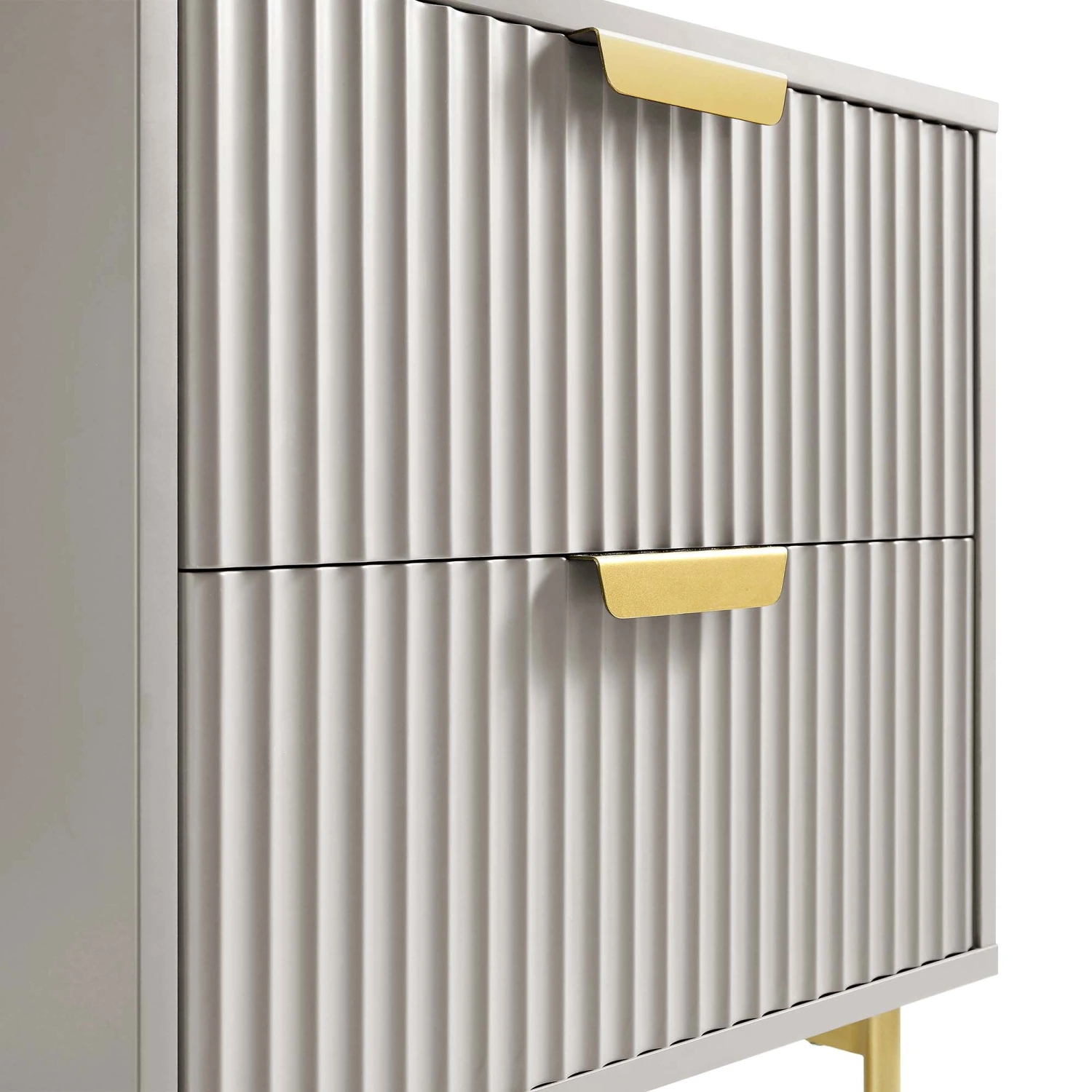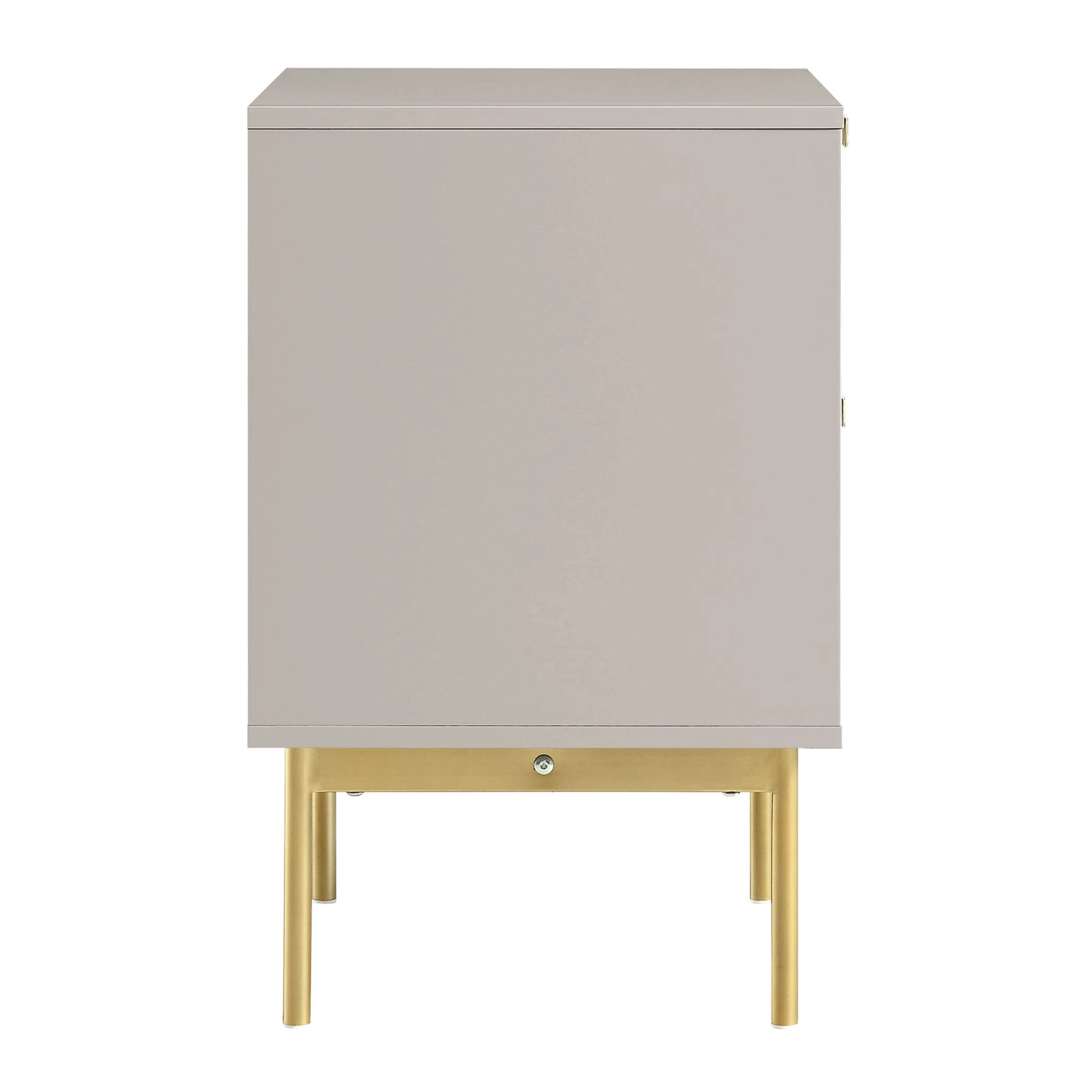 - The cabinet features ridged door surface finished in matte taupe paint paired with gold handles and legs, ideal for neutral tone home decor.