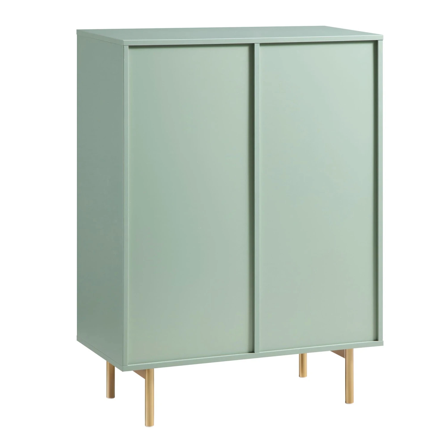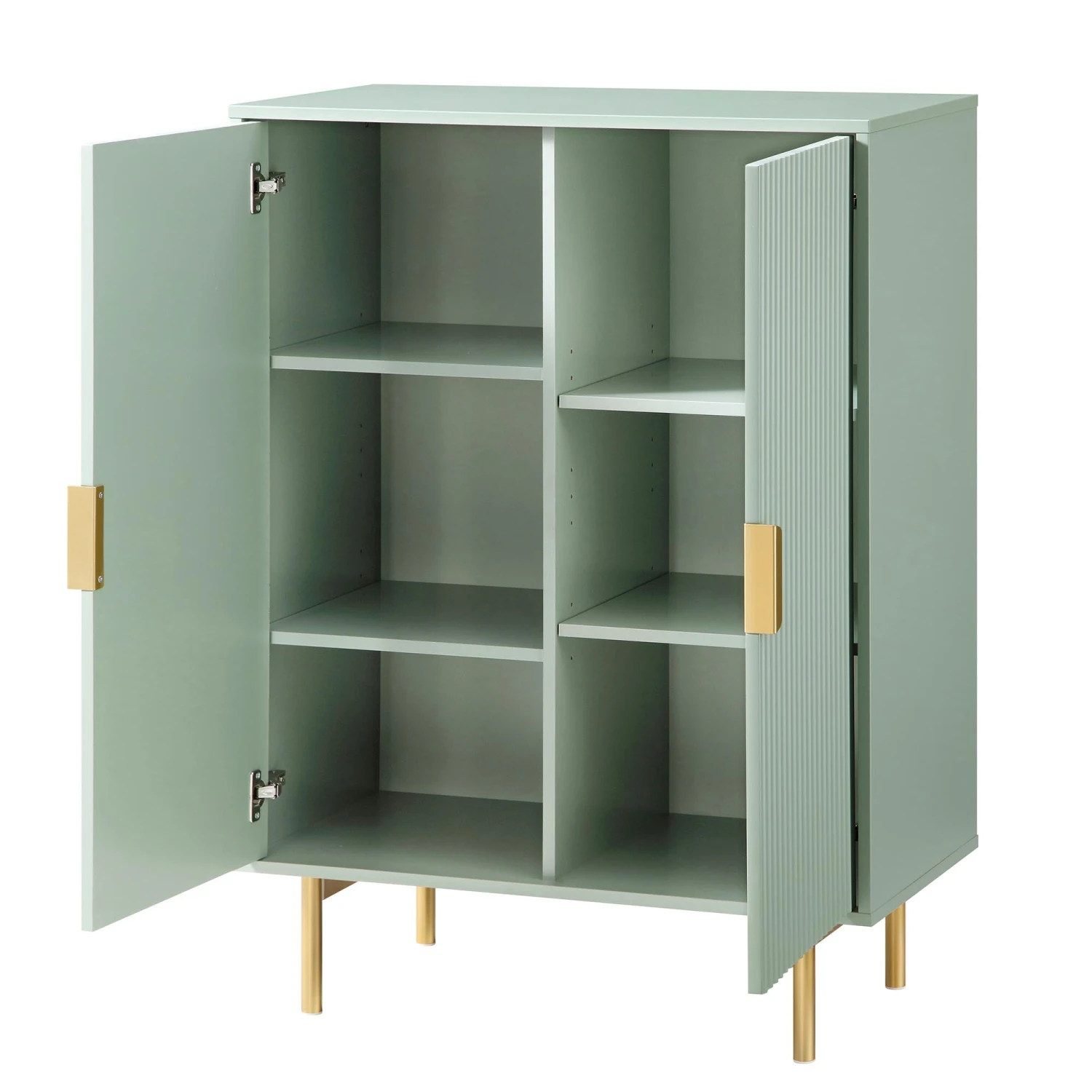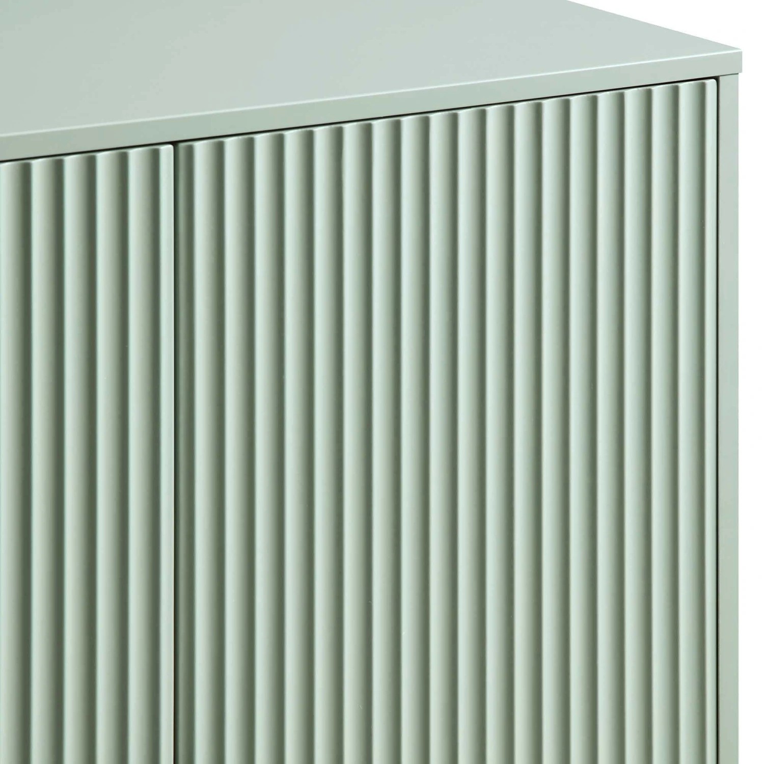- The cabinet features ridged door surface finished in matte sage green colour paint, paired with gold handles and legs.