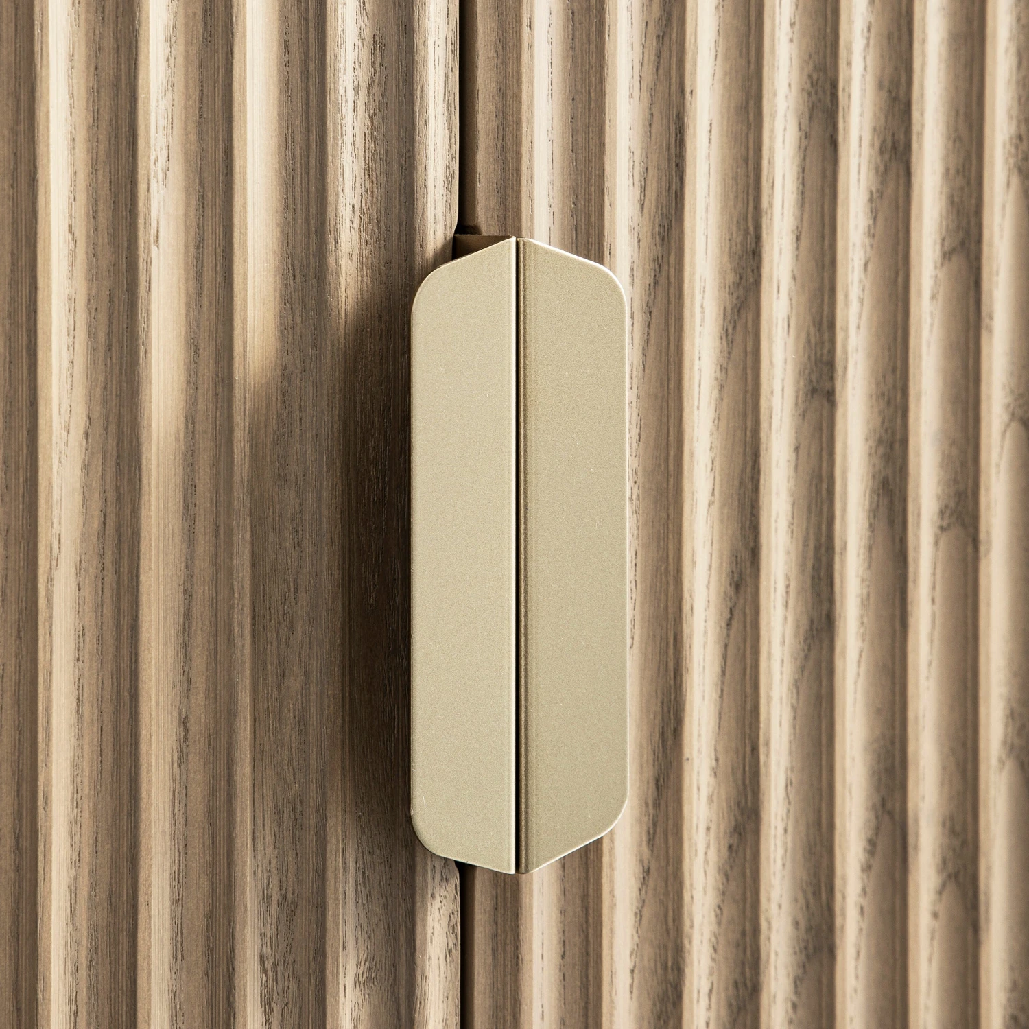 - The sideboard features ridged door surface finished in light shaded stain, paired with gold handles and legs.