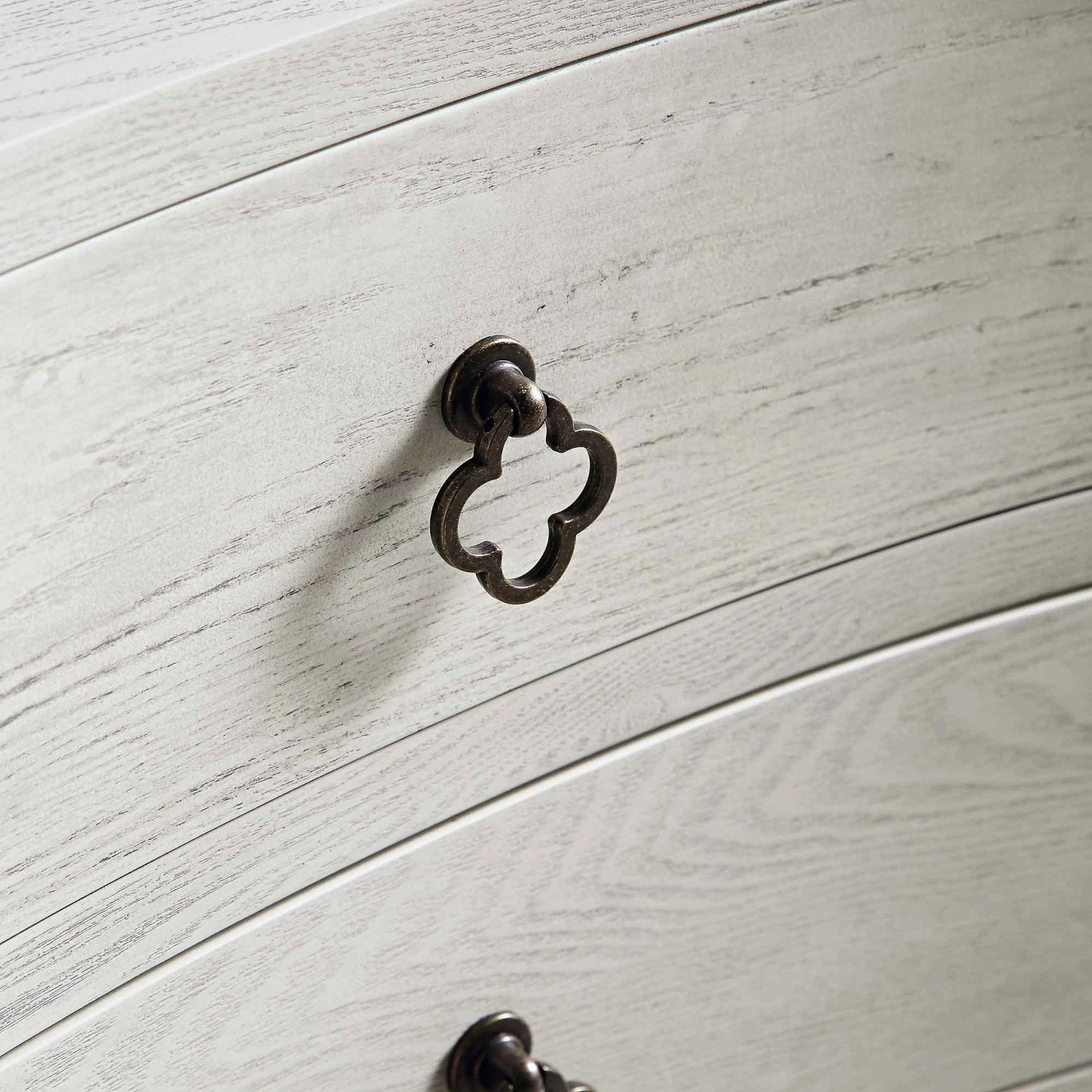 - Gently concave drawer fronts are complemented with the aged brass clove metal handles.
